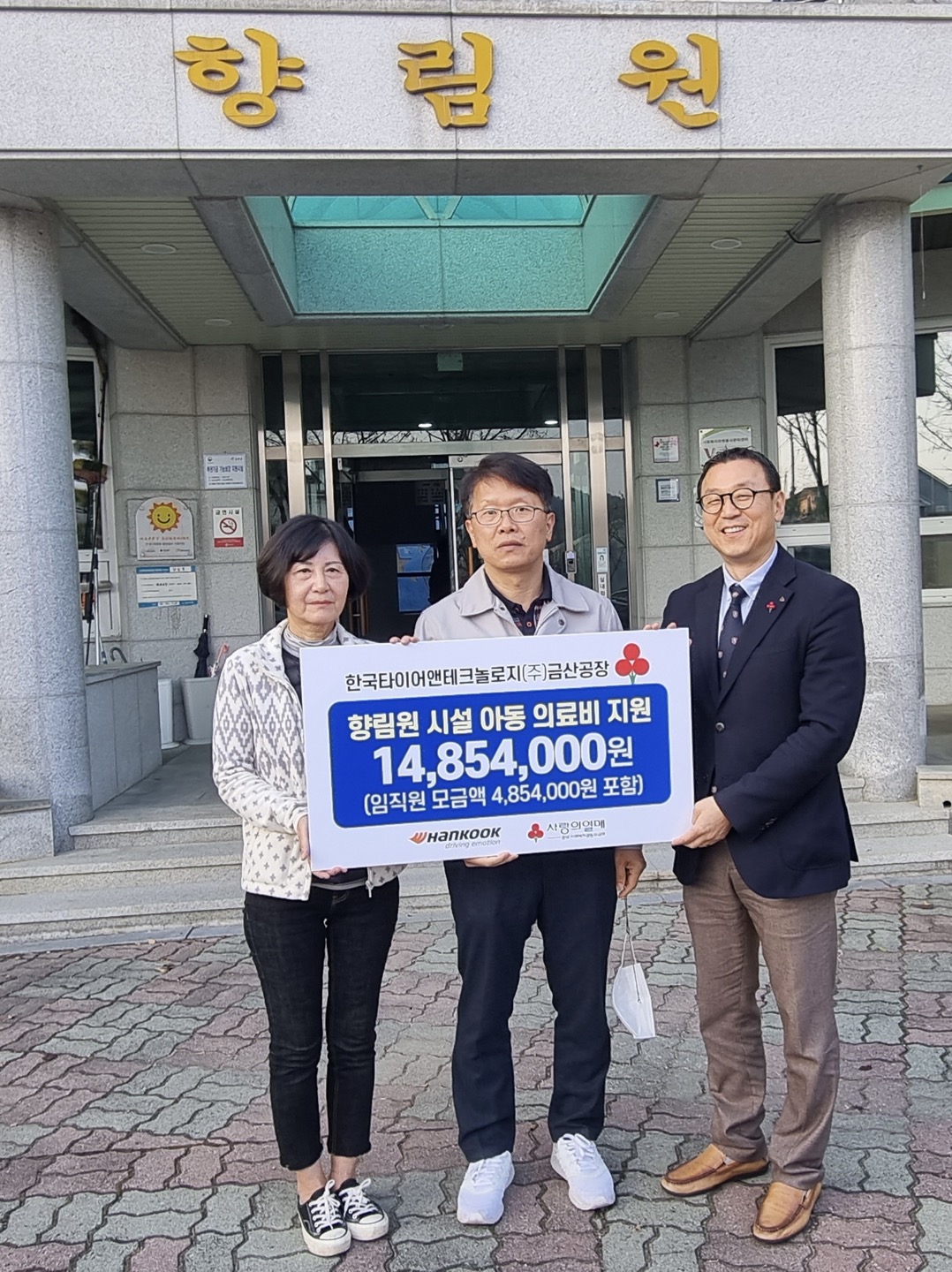 이날 전달된 성금은 지난 10월 25일 충남 금산군 추부면 일원에서 졸음운전을 하던 승용차가 인도로 돌진해 교통사고 피해를 입은 향림원 아동들의 치료비 지원을 위해 마련됐다. 가해 운전자는 책임보험만 가입돼 있어 피해자가 병원비를 부담해야 하는 어려운 상황이다. 한국타이어는 기부금 10,000,000원과 함께 한국타이어 금산공장 임직원들이 자발적으로 모은 성금 4,854,000원을 더해 총 14,854,000원을 전달했다.